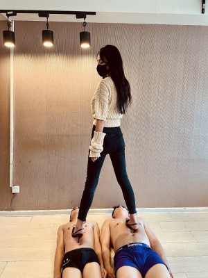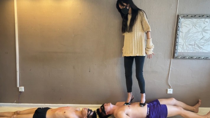 内容:贝儿女神穿着尖头细高跟,全体重踩踏责罚脚下的两个M(其中一个特别瘦小,排骨男)伴随响亮的轮流耳光,高跟鞋虐乳,强制脚深喉等,脚下的两个M忍受着剧烈痛苦嗷嗷叫,又体验着被女神近距离调教的快感。全片时长长达42分钟,相当于两部作品的时长,绝对让你大饱眼福。